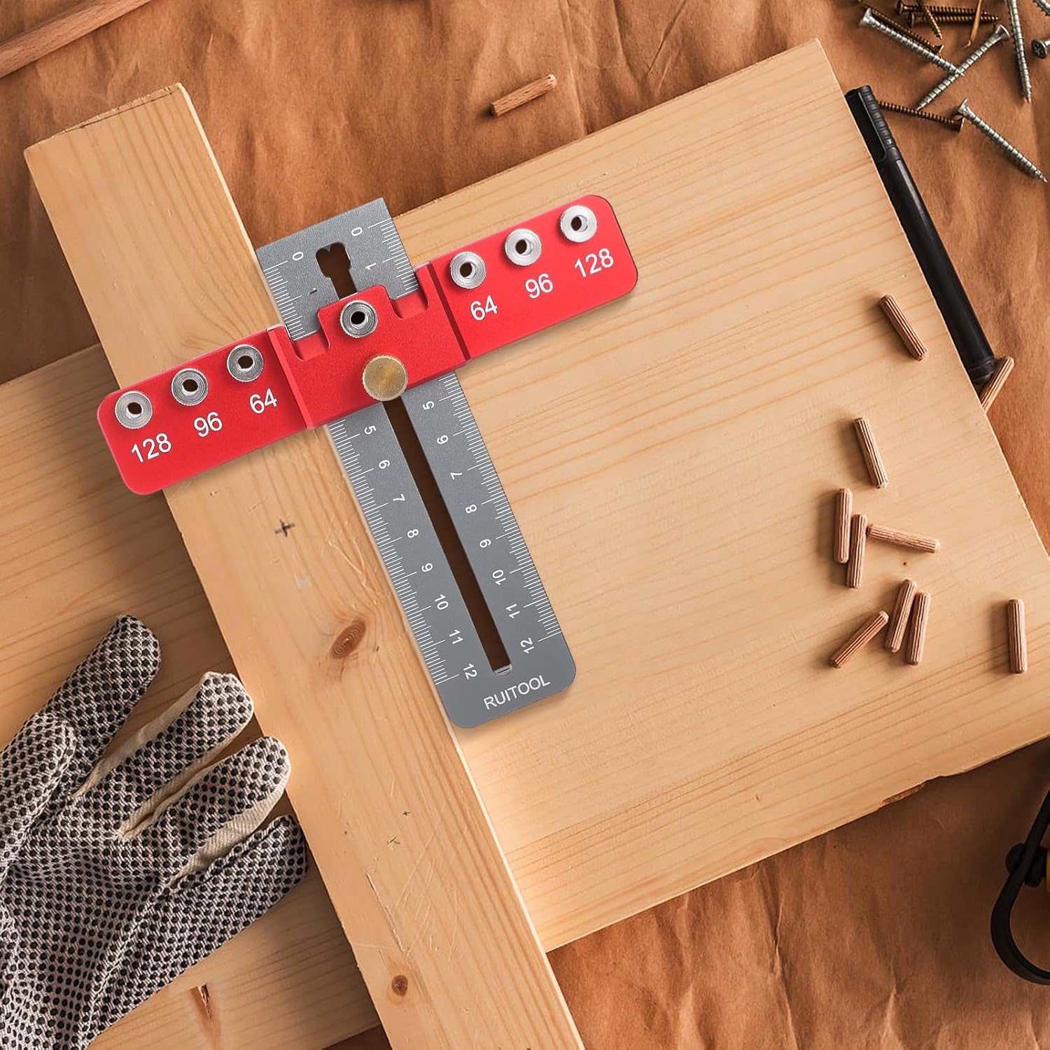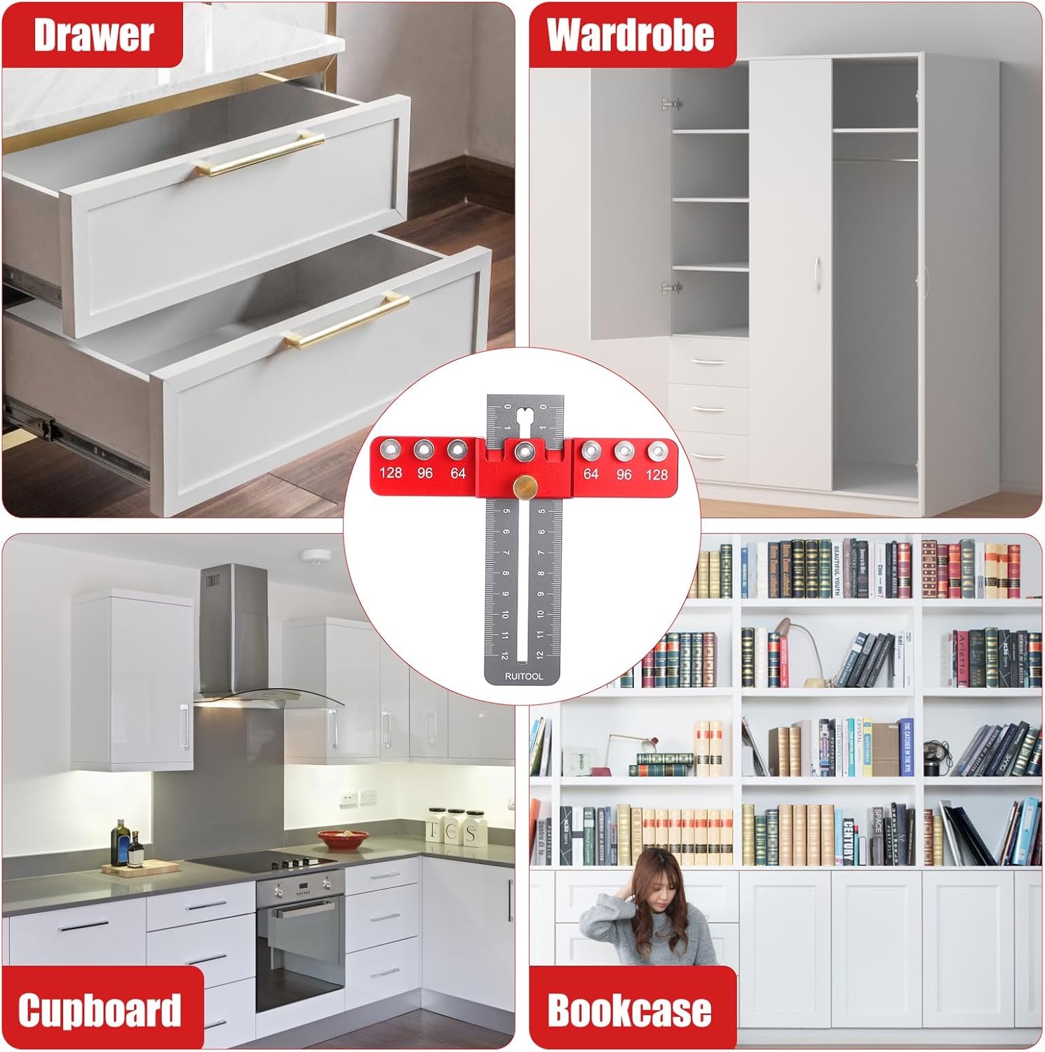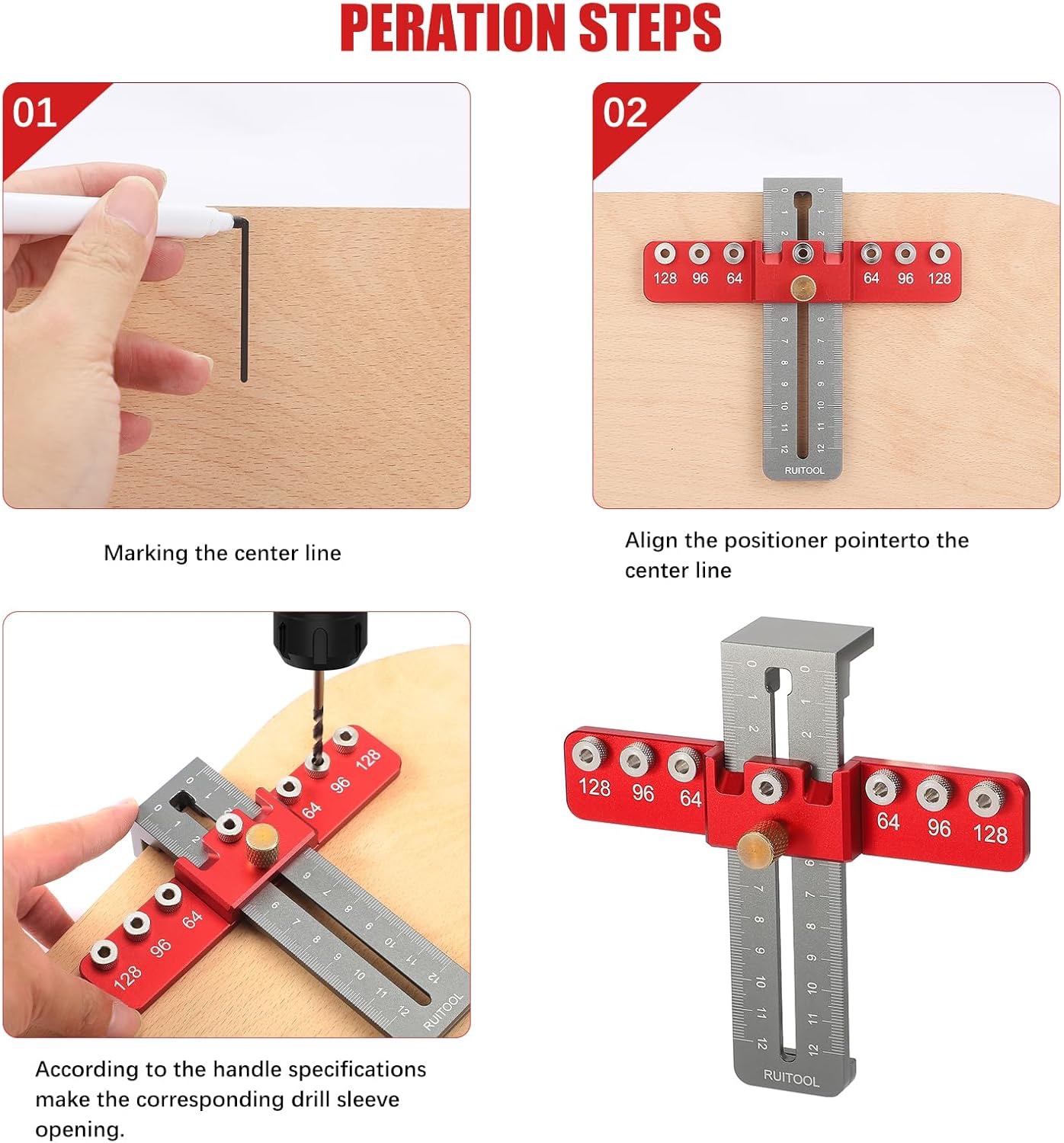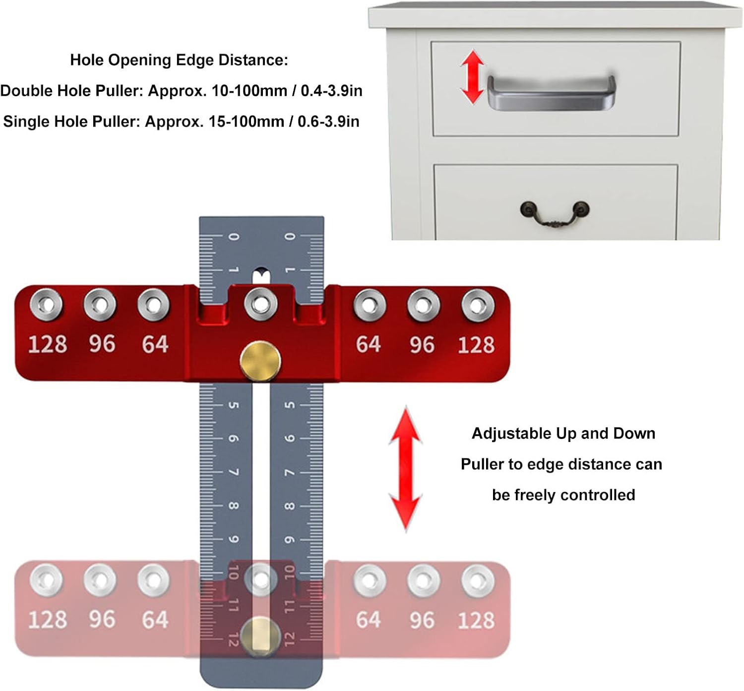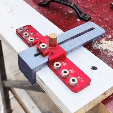 To narzędzie obsługuje typowe rozstawy otworów uchwytów 64 mm 96 mm i 128 mm, a także otwory centralne. Tuleja wiertarska 4 mm zapewnia powtarzalne pozycjonowanie, dzięki czemu narzędzie nadaje się do większości uchwytów szafek i szuflad.