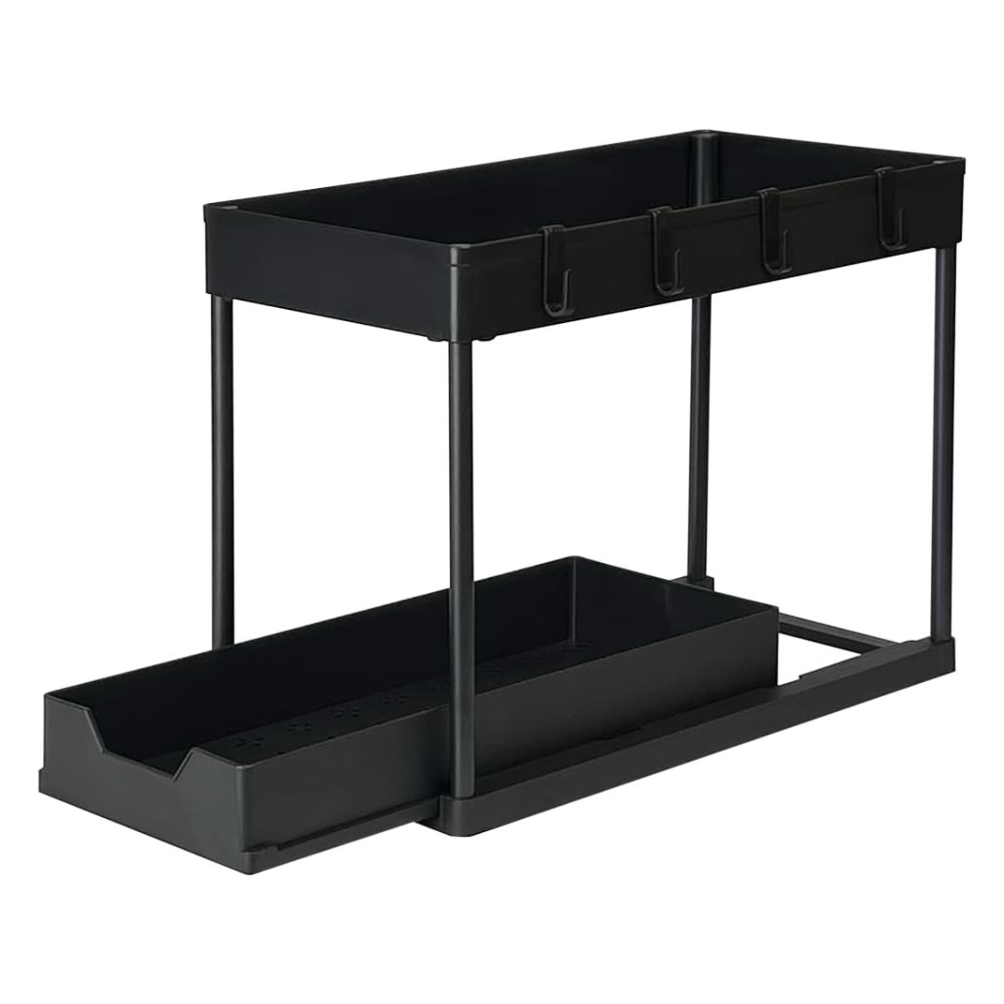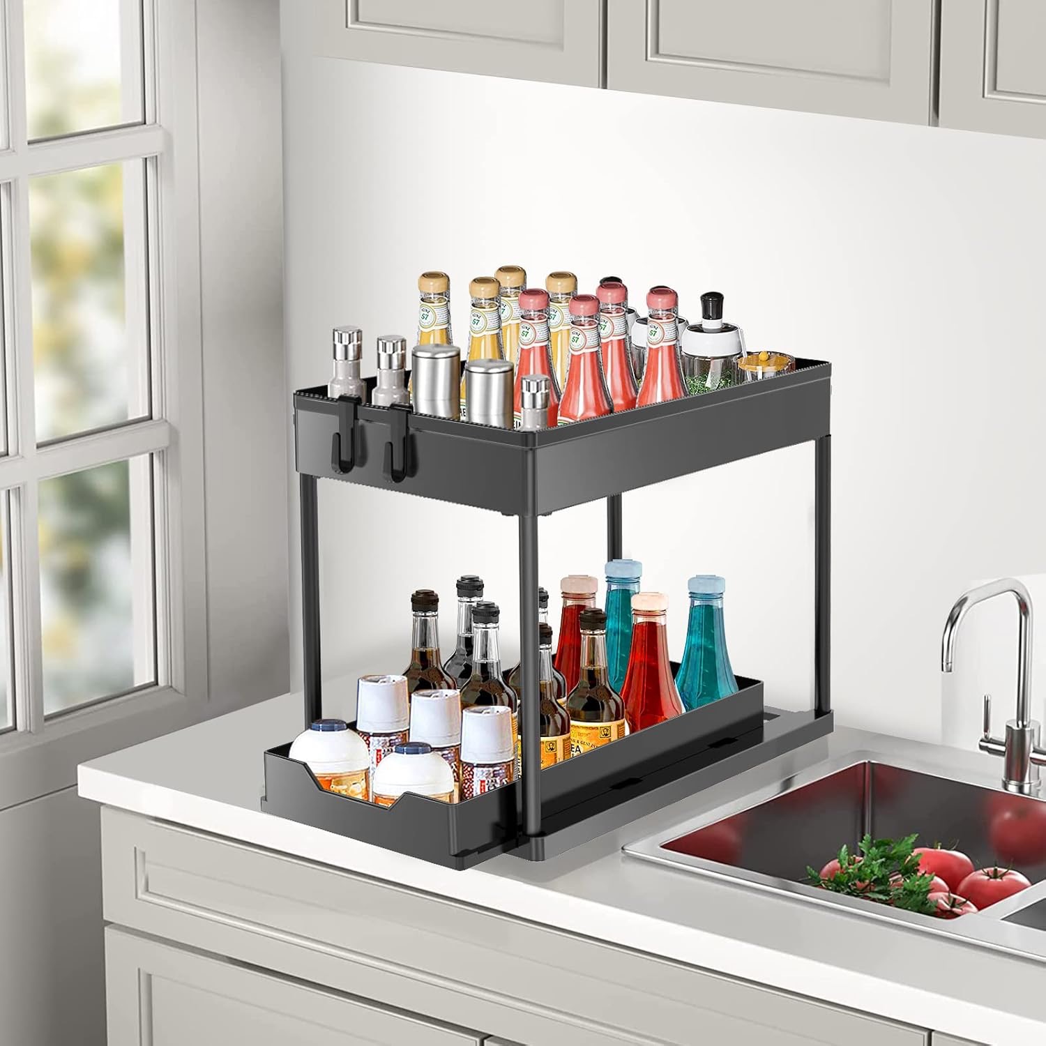 Dwupoziomowa, wysuwana konstrukcja pomaga w pełni wykorzystać przestrzeń pionową w szafkach lub spiżarni, utrzymując wszystko w porządku i na swoim miejscu.