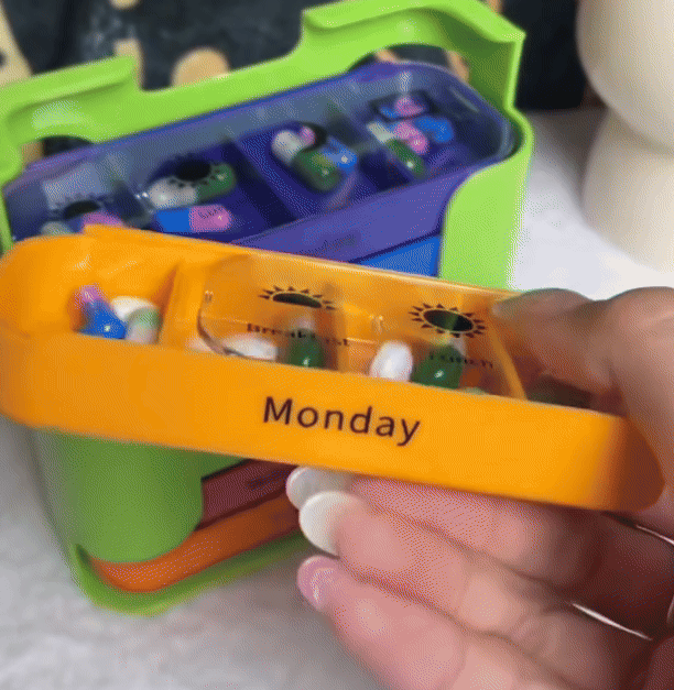 Każda przegródka otwiera się i zamyka płynnie, zapewniając szybki i łatwy dostęp bez irytacji 👌 Przejrzysty, opisany układ pomaga zachować regularność przyjmowania leków i wspiera terminowe, precyzyjne dawkowanie każdego dnia.