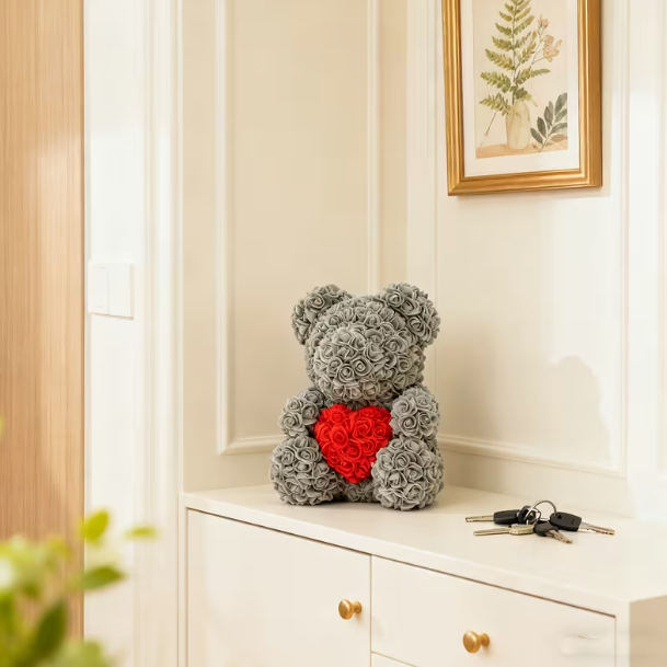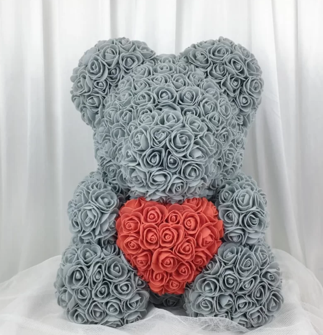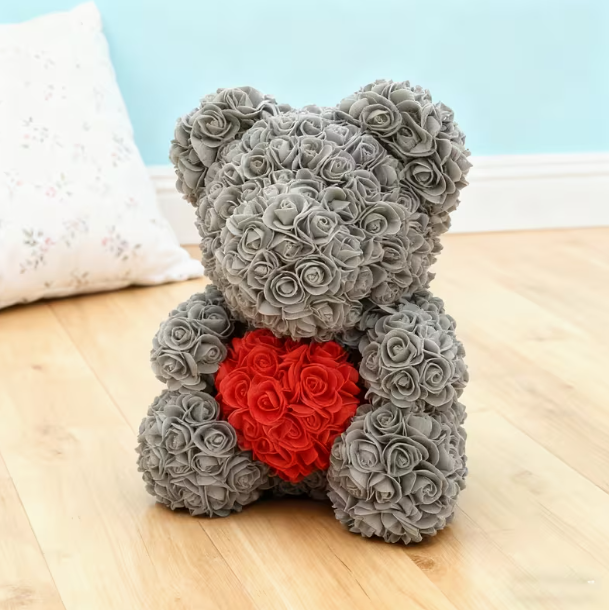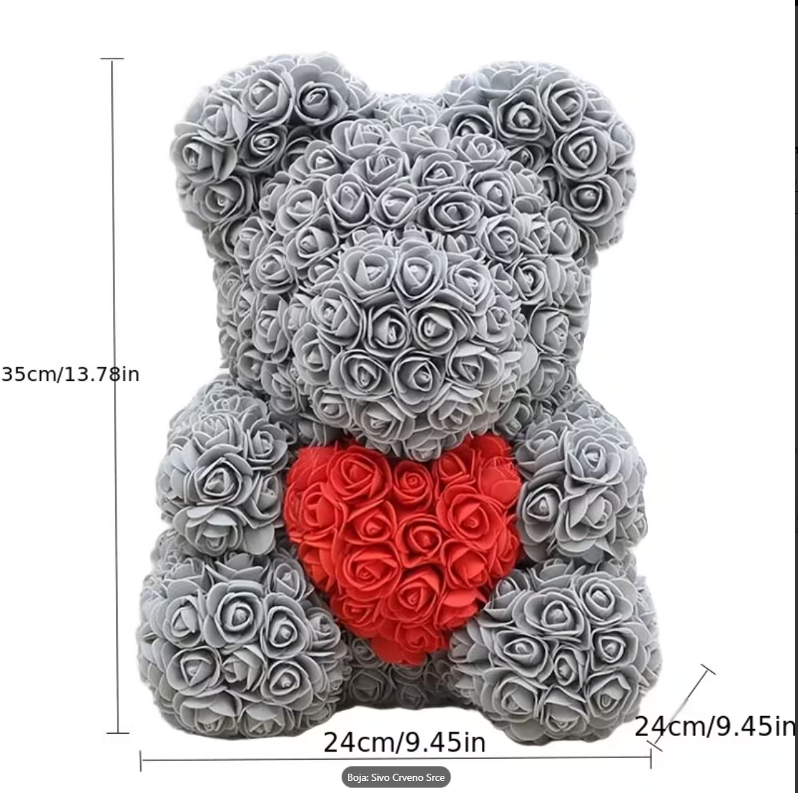 Miś jest ręcznie wykonany z sztucznych róż, które zachowują swój kształt i kolor, zapewniając długotrwały efekt dekoracyjny. To idealny wybór dla wszystkich, którzy szukają prezentu o trwałej wartości i silnej symbolice uczuć 🌹.