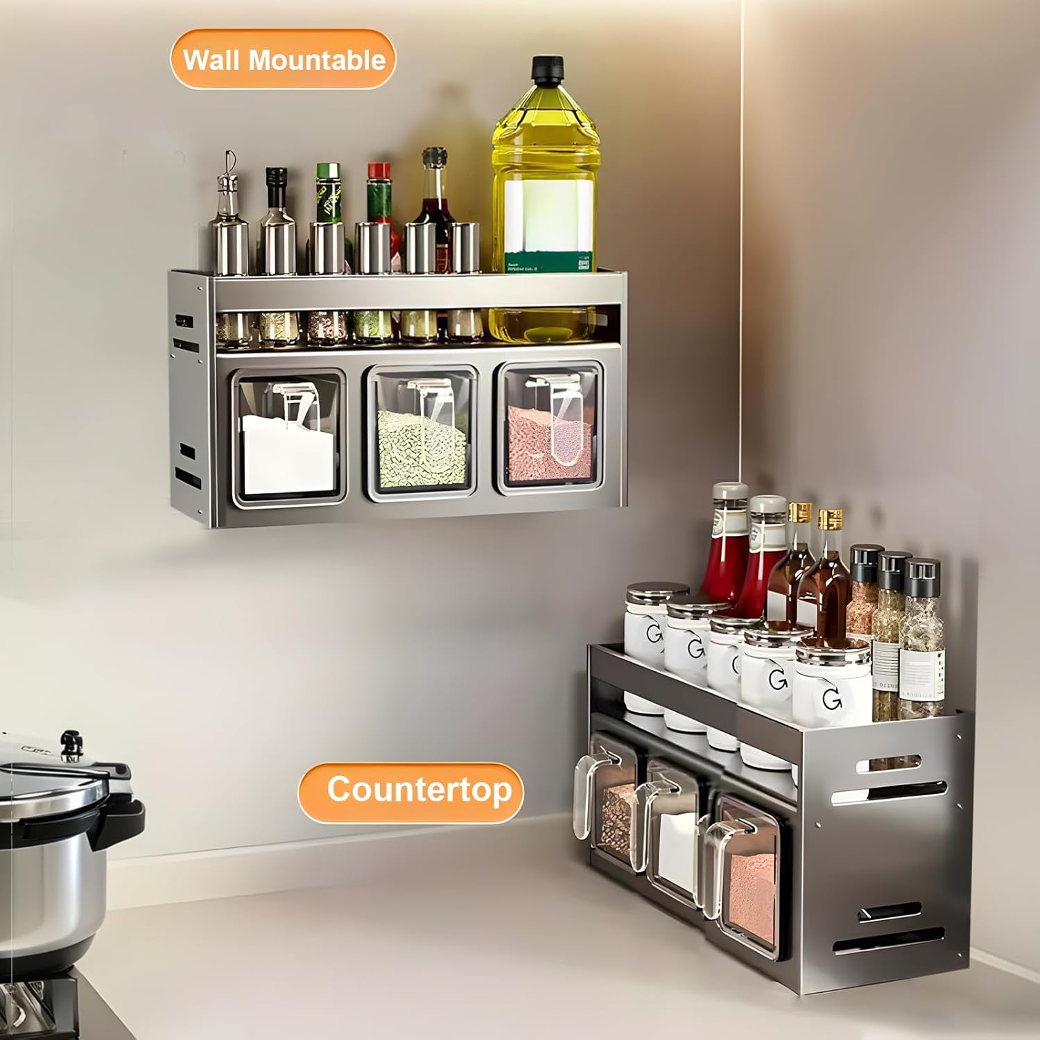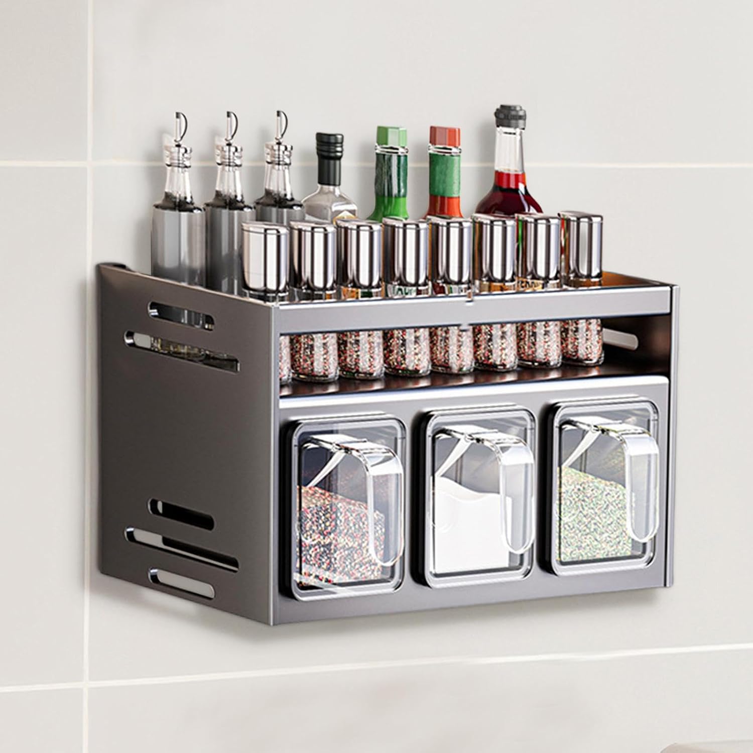 Dwupoziomowa konstrukcja zapewnia więcej miejsca i pełną kontrolę nad wszystkimi buteleczkami i pojemnikami. Przechowywanie jest łatwe, a przyprawy zawsze masz pod ręką, co wzbogaca twoje kulinarne doświadczenia.