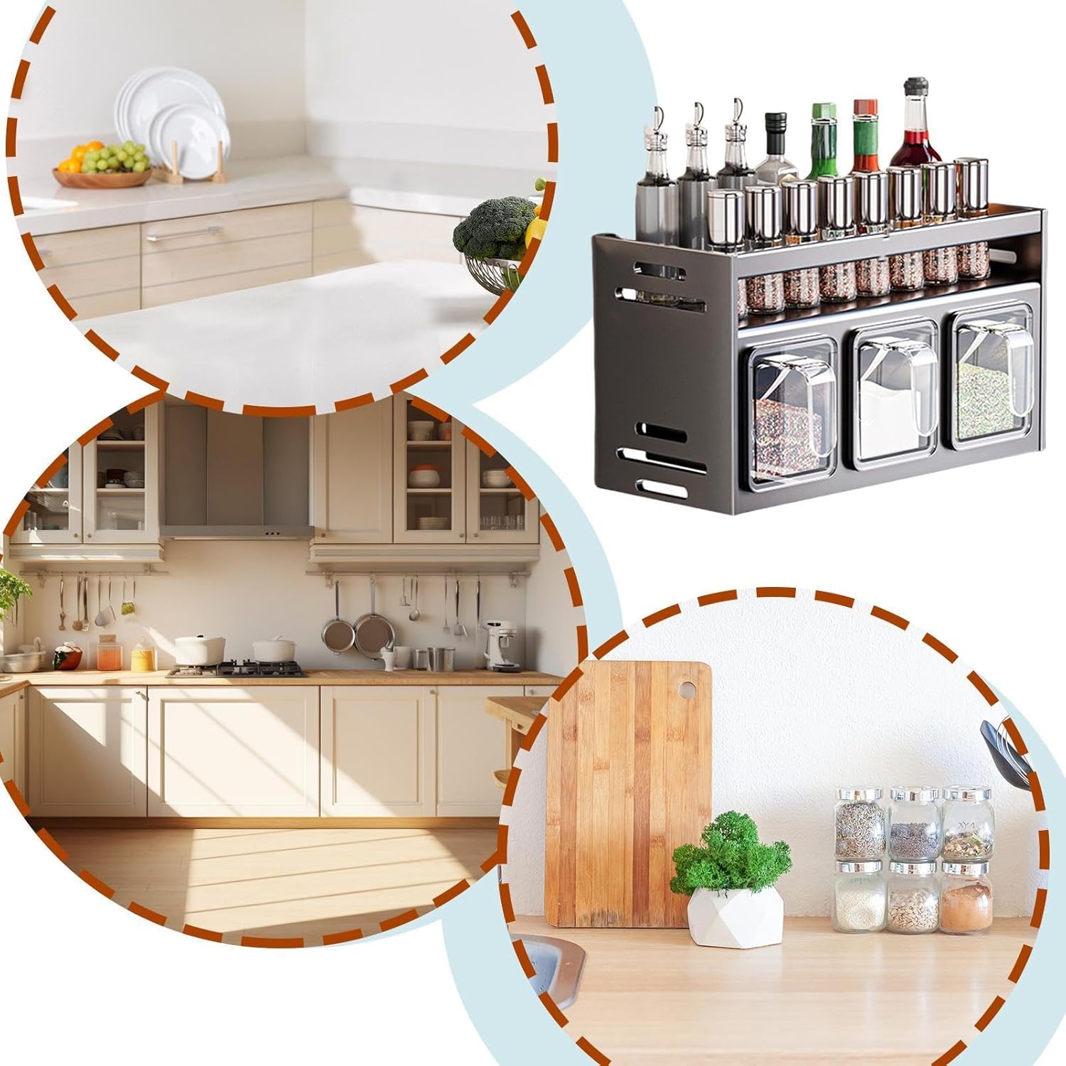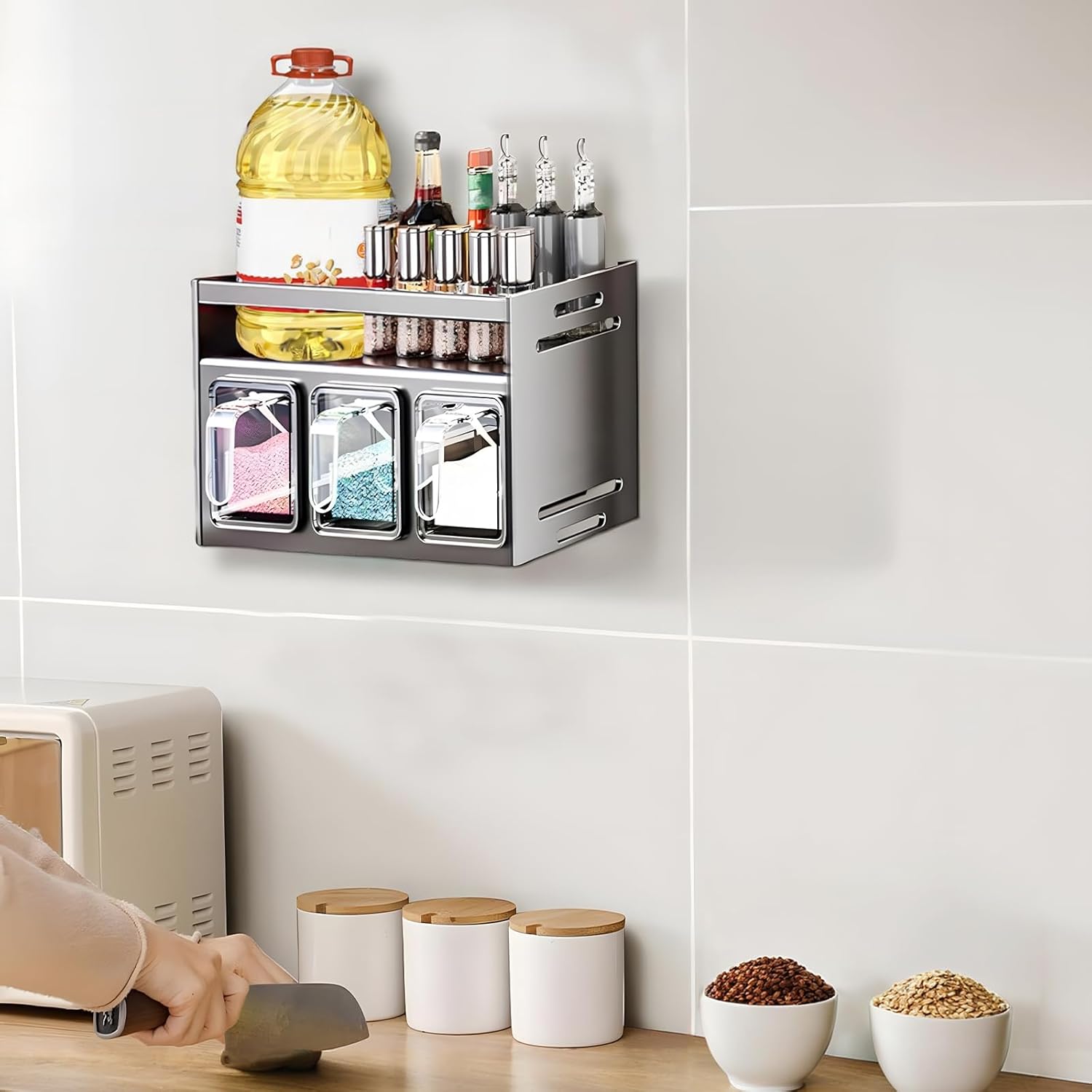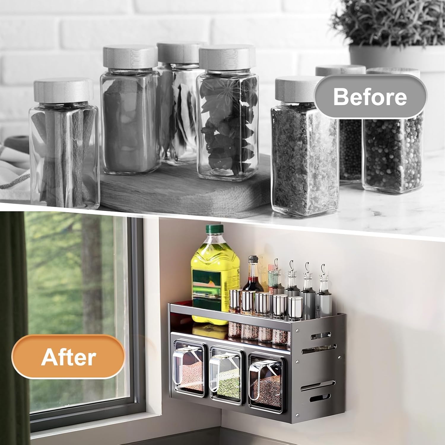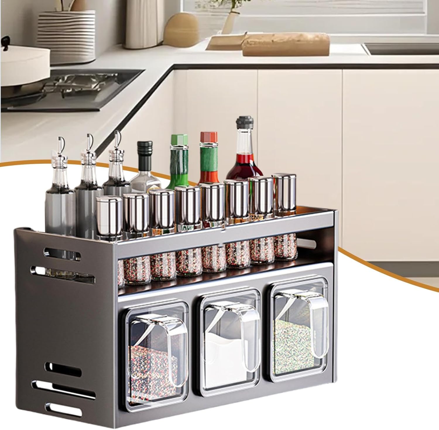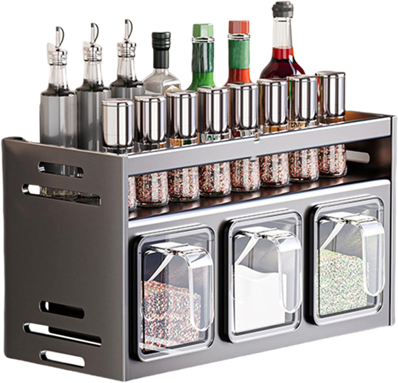 Dwupoziomowa konstrukcja zapewnia więcej miejsca i pełną kontrolę nad wszystkimi buteleczkami i pojemnikami. Przechowywanie jest łatwe, a przyprawy zawsze masz pod ręką, co wzbogaca twoje kulinarne doświadczenia.